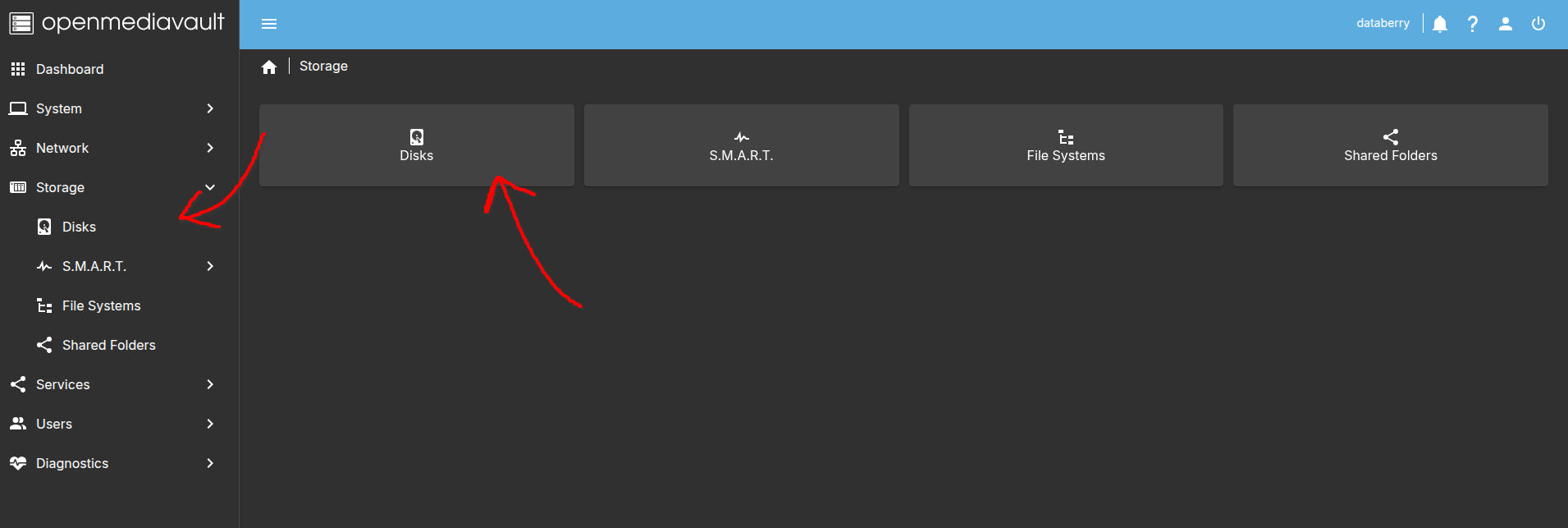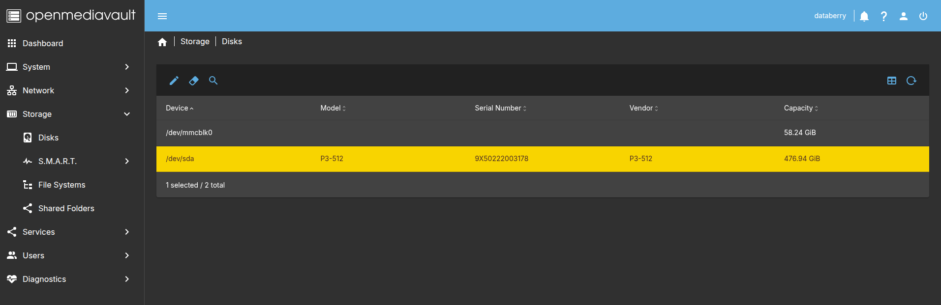 Let's connect now our external hard drive, where all the data will be stored. In order to see if OMV can detect it: under Storage click on Disks