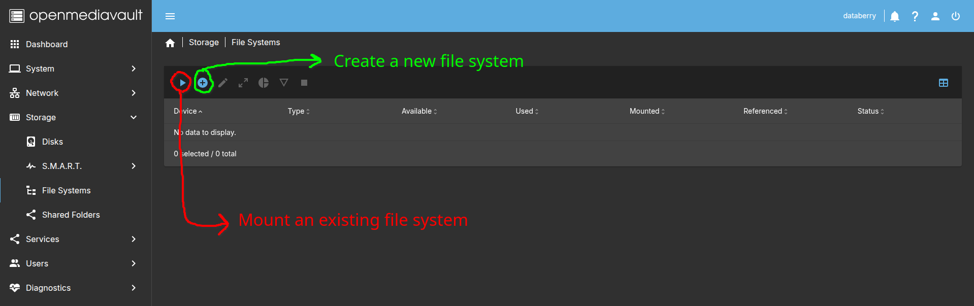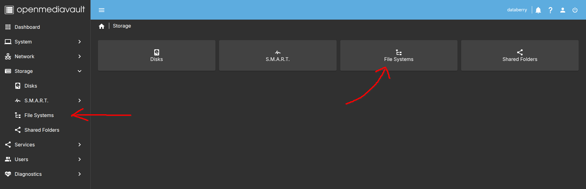 Now you are sure that the storage is seen, and we can mount it. In order to do so, let's click on Storage again, and then File System.